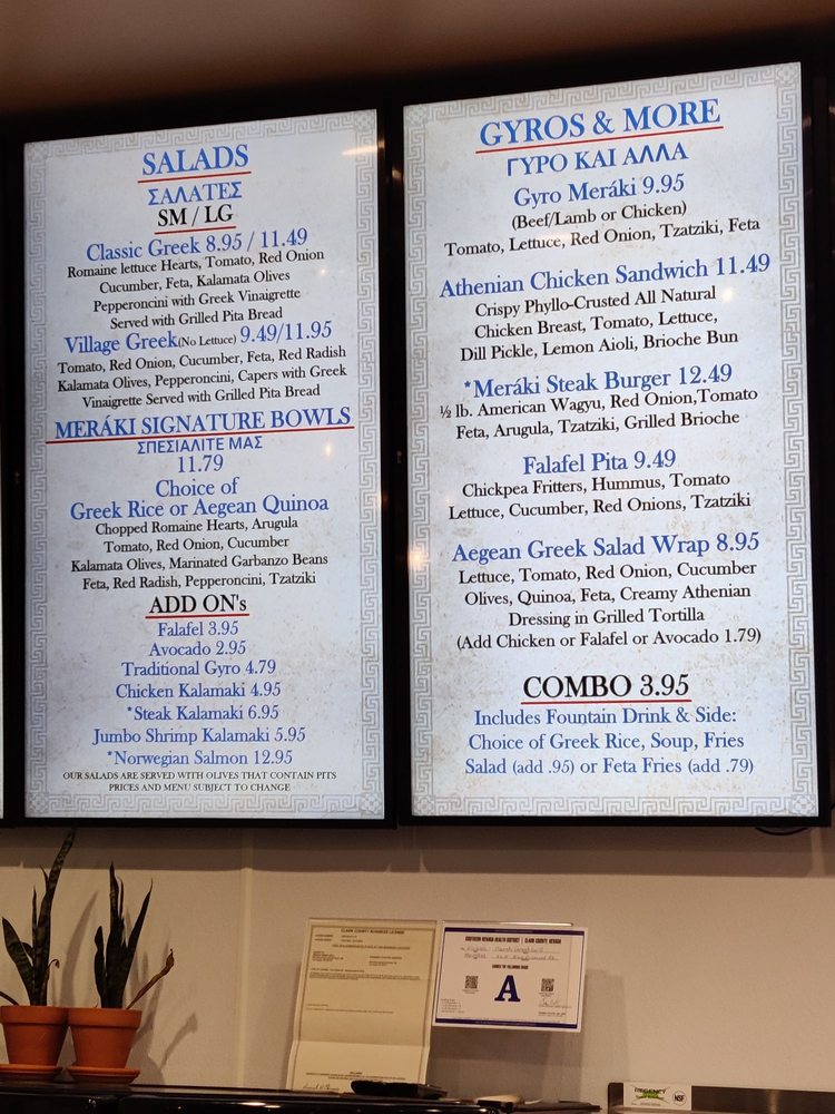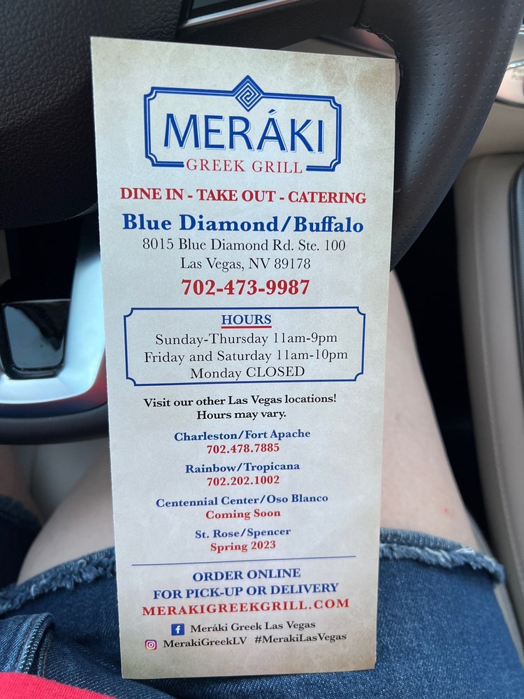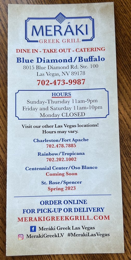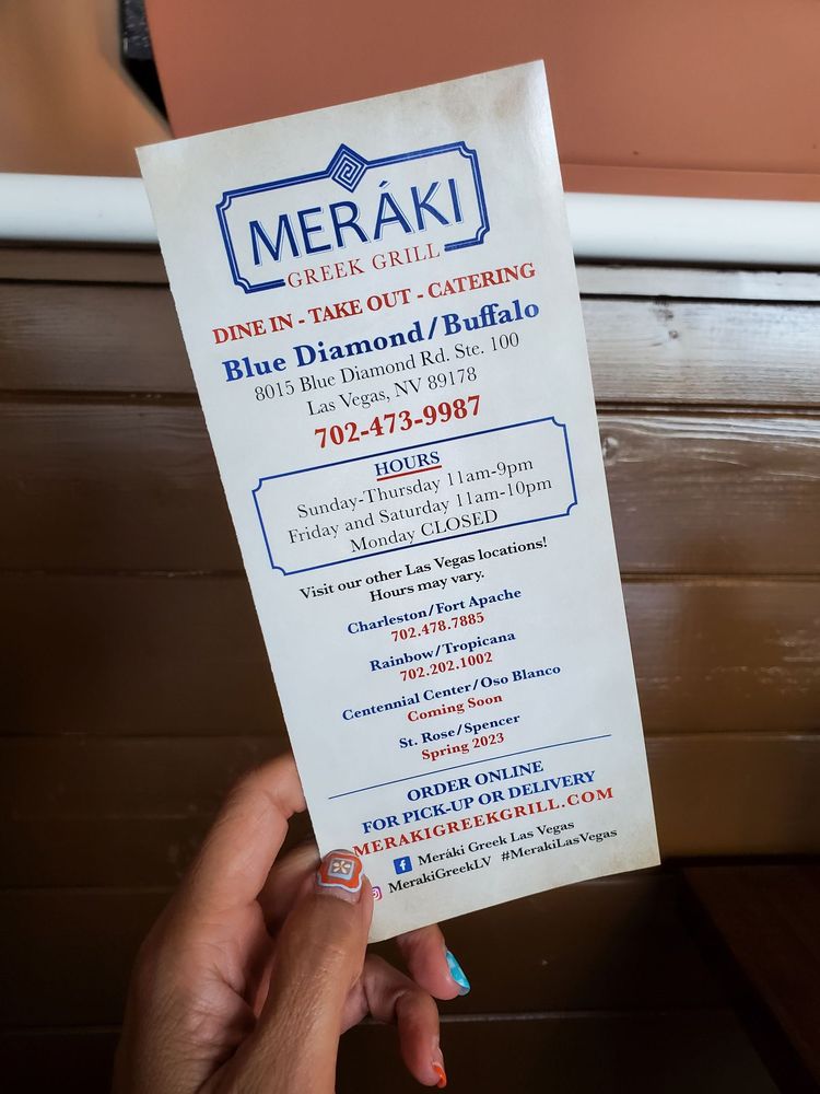 Meráki Greek Grill in Blue Diamond/Buffalo offers a diverse menu of authentic Greek and Mediterranean dishes. With a focus on fresh ingredients and flavorful options, this restaurant provides a variety of appetizers, spreads, salads, and classic Greek dishes. The Spread Trio and Pita is a must-try for those looking to sample a selection of Greek flavors. Customers rave about the generous portions, friendly staff, and cozy ambiance of the restaurant. The Greek salads are praised for their freshness and vibrant flavors, making them a perfect choice for a light and satisfying meal. Whether you're craving a traditional gyro or a savory mezze plate, Meráki Greek Grill is a top choice for delicious Greek cuisine in Las Vegas.