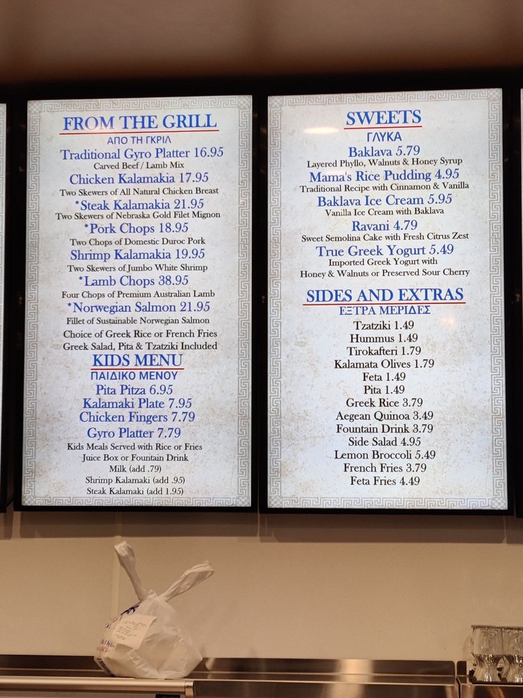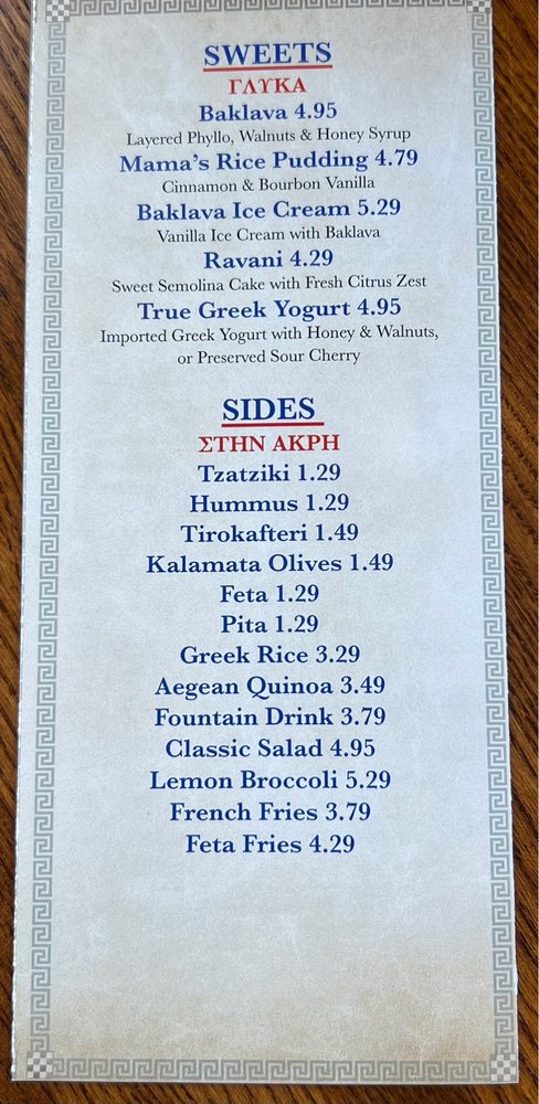 Choice of 2 Spreads 8 Pitas 8 Dolmadakia Choice of 8 Kalamaki or Carved Gyro Greek Rice or French Fries Classic Greek Salad Choice of 4 Desserts 4 Fountain Drinks (Add 1.49 per Shrimp Kalamaki and per Steak Kalamaki) NO SUBSTITUTIONS PLEASE