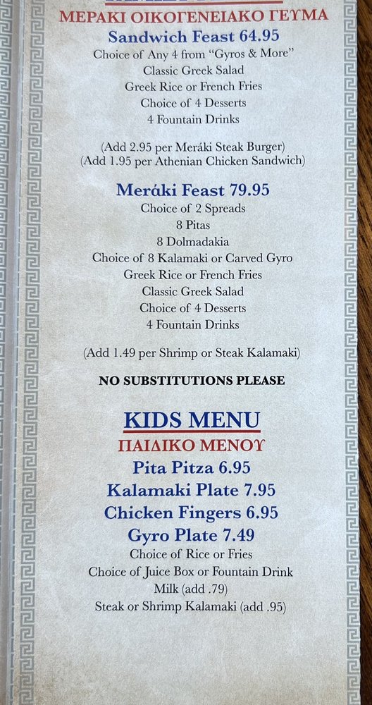 Choice of any 4 from Gyros & More Classic Greek Salad Greek Rice or French Fries Choice of 4 Desserts 4 Fountain Drinks NO SUBSTITUTIONS PLEASE